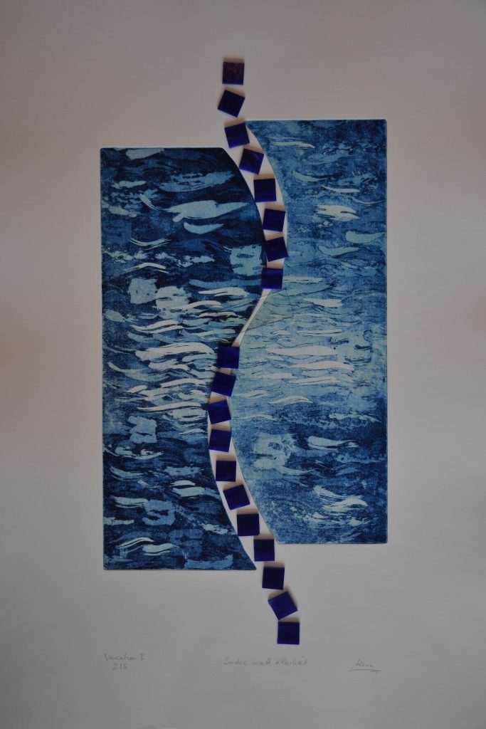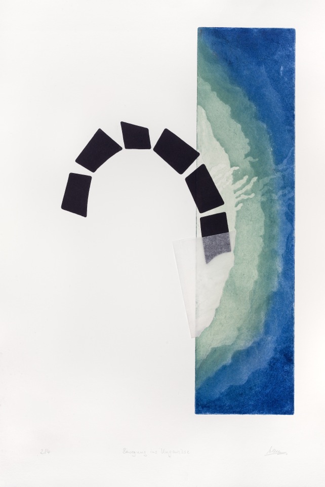 Die Künstlerin kombiniert ihre Radierungen zum Teil mit Collage-Technik und oder der Verwendung von mehrern Druckplatten und geht so über die Ausdrucksmöglichkeiten klassischer Radierungen hinaus.